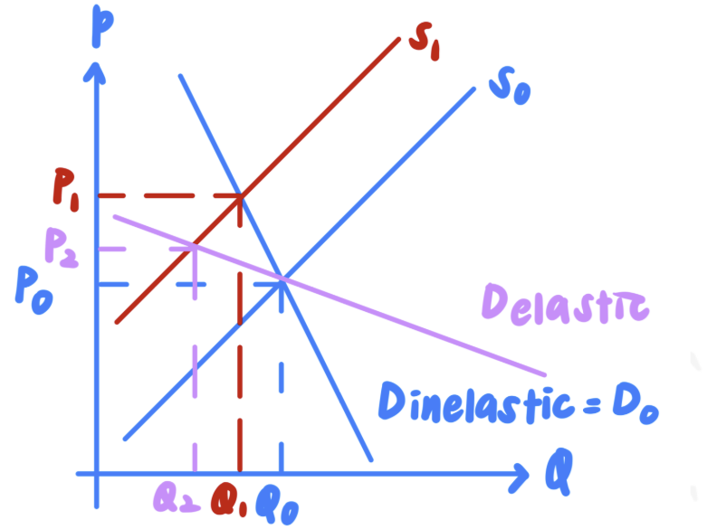 Bad weather has an adverse impact on crops and harvests, leading to a fall in supply of agricultural products and an increase in prices. Initially, the equilibrium prices and quantity of vegetables is at Q₀, P₀ where D₀ = S₀. When there is bad weather, the supply of vegetables falls from S₀ to S₁. Given that vegetables have a high degree of necessity given that it is a staple food, the demand for vegetables is likely to be inelastic (PED < 1), as illustrated by Dinelastic. This means that a fall in supply from S₀ to S₁ will lead to a sharp increase in prices of vegetables from P₀ to P₁. This is in comparison to the demand for vegetables of elastic (as illustrated by Delastic), in which prices will only see a slight increase from P₀ to P₂.