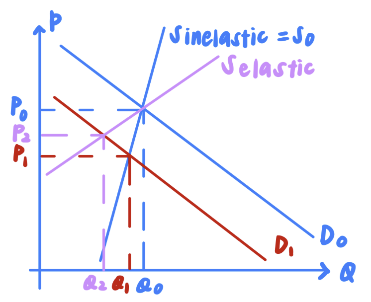 With a fall in consumer income, there will be a fall in purchasing power leading to a fall in demand for normal goods. Initially, the equilibrium prices and quantity of vegetables is at Q₀, P₀ where D₀ = S₀. Vegetables are a normal good (YED > 0), more specifically a necessity (YED < 1). Hence a fall in income will lead to a fall in Demand from D₀ to D₁. Given the vegetables take a long time to grow (long length and complexity in production), supply for vegetables is likely to be inelastic (PES < 1), as illustrated by Sinelastic. This means that a fall in demand from D₀ to D₁ will lead to a sharp fall in prices of vegetables from P₀ to P₁. This is in comparison to the supply for vegetables of elastic (as illustrated by Selastic), in which prices will only see a slight decrease from P₀ to P₂.
