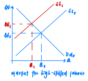 Secondly, the decrease in supply of high-skilled labour has caused an increase in wages for high-skilled labour. IN recent years, the Singapore government has tightened its immigration policies for high-skilled labour, this to ensure that the local workforce is prioritised and to address growing concerns over job competition. The government raised the minimum salary requirement for new employment pass holders to $5000 and $5500 for those in the financial service sectors. This thus restricts the supply of high-skilled labour as firms cannot rely on the foreign labour supply as much. This thus leads to a decrease in supply of high-skilled labour from Q0 to Q1 caused by a leftward shift in the supply curve from Ss0 to Ss1, and thus wages increase from P0 to P1.