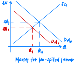 Firstly, the decrease in demand for low-skilled labour can be caused by government regulation in light of globalisation. Due to globalisation, with the availability of cheap and abundance of labour in other countries which caused many manufacturing and labour intensive industries like textiles to offshore to other countries from SIngapore, the Singapore government realised that Singapore will eventually lose its export competitiveness and comparative advantage in labour intensive and manufacturing sectors, Thus, the government shifted focus to the high-end technological sector, For instance, Singapore used to be a fishing port and produced lots of textiles for exports, however with globalisation, the government shifted focus to develop high end sectors through export-oriented industrialization, implementing policies like the export credit insurance scheme that attracted many MNCs. This thus resulted in a decrease in demand for low-skilled labour, causing a leftward shift of the demand curve from Dd0 to Dd1. The quantity demanded for low-skilled labour decreased from Q0 to Q1, and wages fell from W0 to W1.