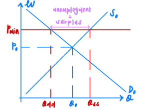 Minimum wage law is one whereby the wage is set above the equilibrium wage of P0, at Pmin, acting as a price floor. The minimum wage is set by the government to be the lowest hourly, weekly, or monthly pay an individual should receive. It aims to raise the living standards of low-skilled workers, ensuring that they are not exploited and overworked for their salary. This can effectively reduce income inequality as it ensures the low-skilled a minimum wage to take home, rather than leaving it to firms to decide their wage, which are often low due to their profit-maximizing nature. At the new wage Pmin, the supply of labour increases as more people are willing to work at this higher wage enter the market, causing the supply of labour to increase to Qss. However, at the higher wage, firms are less willing to hire workers as it increases their cost of production, the demand for labour thus decreases to Qdd. Since the quantity demanded for labour is lesser than the quantity supplied, there is a surplus of labour, resulting in unemployment.