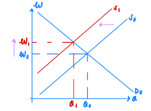 Tightening the foreign worker quota policy in terms of restricting the supply of low-skilled labour can effectively reduce income inequality in Singapore. The Singapore government can decrease the pool of low-skilled labour available through getting foreign worker quotas, such as the dependency ratio ceiling (DRC), to regulate the number of foreign workers firms can hire in proportion to their local workforce. The DRC sets the maximum ratio of foreign workers relative to their workforce, which varies across different sectors. For instance, in the service sector, DRC sets a foreign workers quota policy of 35% whereas for the construction sector can hire up to 87.5% of foreigners, By tightening and decreasing the percentage in these industries, firms will face a decrease in supply of low skilled labour as they cannot rely as much on foreigners. This can be seen in the leftward shift of the supply curve from S0 to S1, thus leading to an increase in wages for low-skilled workers from W0 to W1, hence decreasing income inequality.